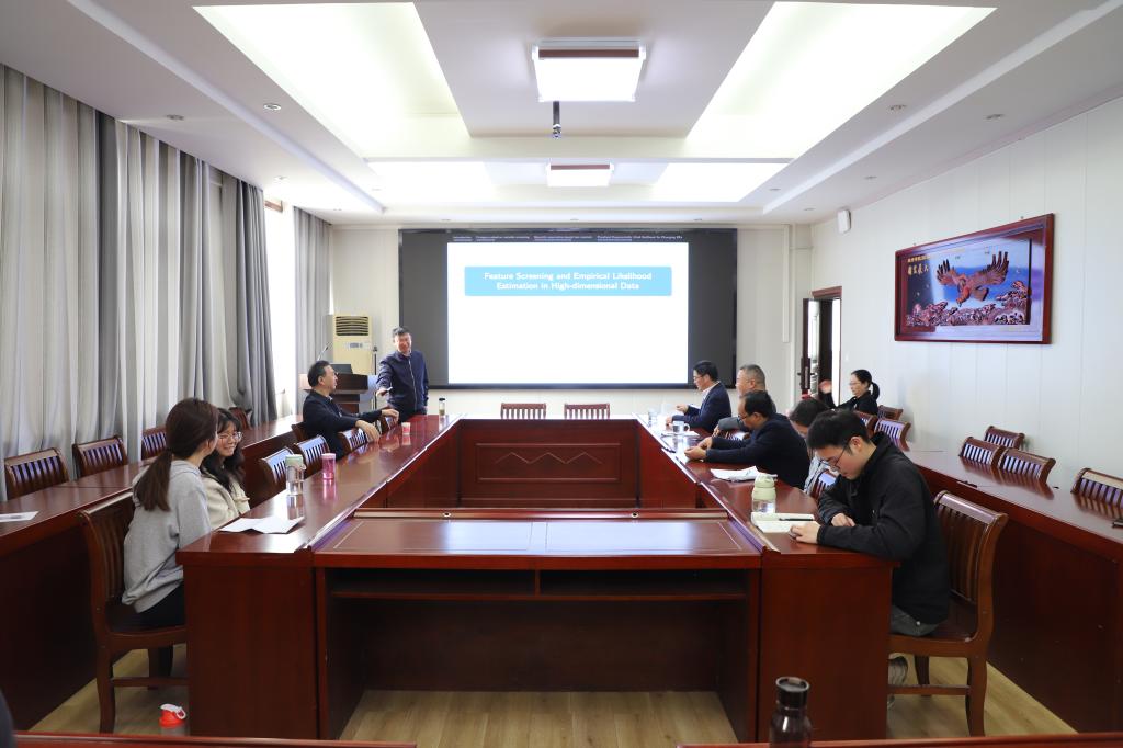 在报告中,唐年胜教授首先介绍了异质分类数据的自适应类别筛选方法、关联分位数的筛选方法和混合型数据的切片融合均方差过滤方法,这些方法均是无模型,对异常值和厚尾数据具有鲁棒性,并具有确定的筛选特性、排序一致性特性。在此基础上,唐教授进一步介绍增长维度广义估计方程中惩罚广义经验似然相关理论、Wilks 理论以及在一些温和条件下的周期特性。唐教授的报告内容丰富,思路清晰。报告结束后,唐教授针对师生们提出的问题给出了独到的解答。