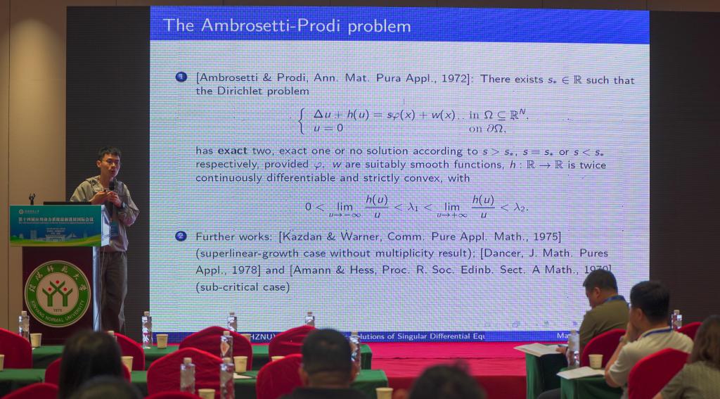 杭州师范大学的余星辰,做了题目为《On the positive periodic solutions of a class of Liénard equations with repulsive singularitiesin degenerate case》的报告。
