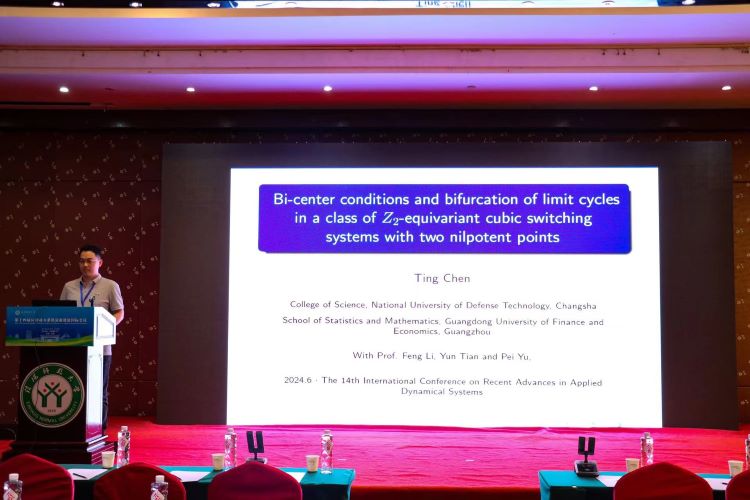 广东财经大学的陈挺做了题目为《Bi-center conditions and bifurcation of limit cycles in a class of Z2-equivariant cubic switching systems with two nilpotent points》的报告。