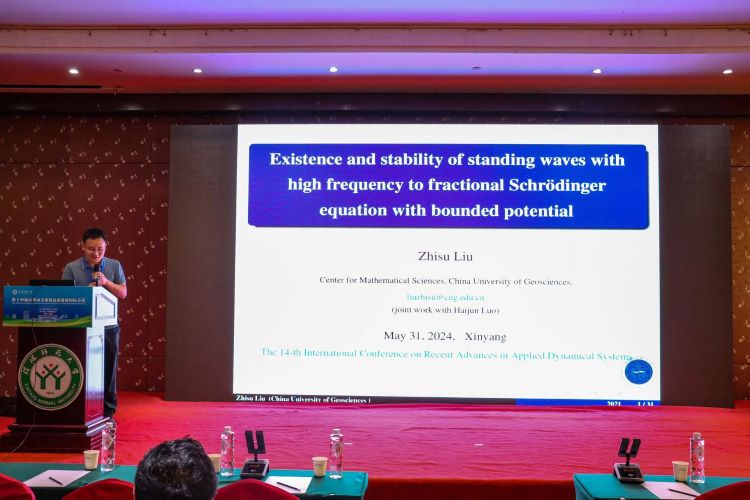 中国地质大学(武汉)的刘志苏做了题目为《Existence and stability ofstanding waves with high frequency to fractional Schrödinger equations with bounded potential》的报告。