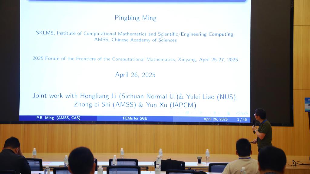 第1场由中国科公司数学与系统科学研究院明平兵研究员作了题目为《Mathematics and Numerics for Strain Gradient Elasticity》的学术报告。