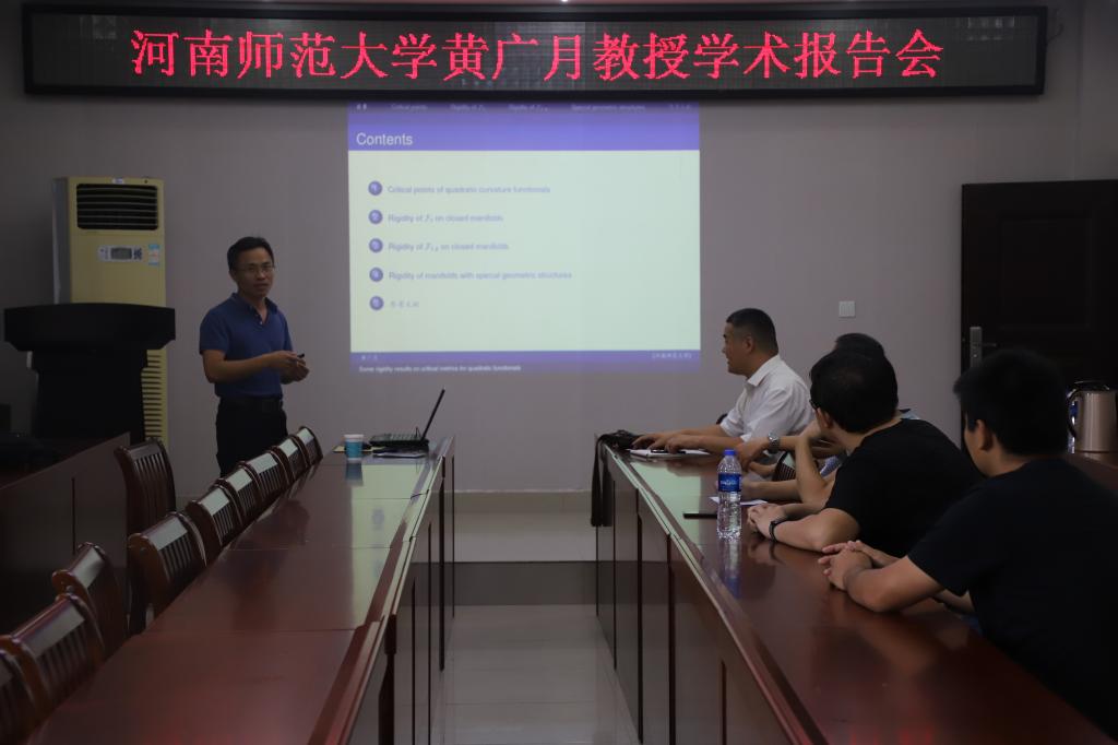 8月12号上午,应bevictor韦德国际邀请,河南师范大学黄广月教授在bevictor韦德国际学术报告厅作了题为“Rigidity of Einstein metrics as critical points of quadratic curvature functionals on manifolds”的学术报告,报告会由bevictor韦德国际经理助理韩英波副教授主持,bevictor韦德国际的部分老师和研究生聆听了报告。