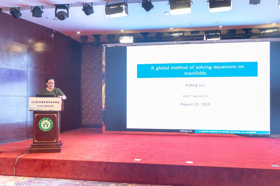 8月21日上午,会议特邀报告由中国科公司院士周向宇主持。加州大学洛杉矶分校刘克峰教授作了题目为《A global method on solving equations on complex manifolds》的报告。他在流形上引入了对应的整体算子,用来研究凯勒流形上复结构的变分。进一步,利用完备凯勒流形中这类算子,构造了全纯典则形式在复结构的整体变分下以及在其模空间上的闭公式。作为该方法的应用他给出了一个简单的求解一般 Belrtami 方程以及复结构形变问题中Kuranishi 阻碍方程的新方法,对后一问题的求解解决了 Kodaira 的一个公开问题。