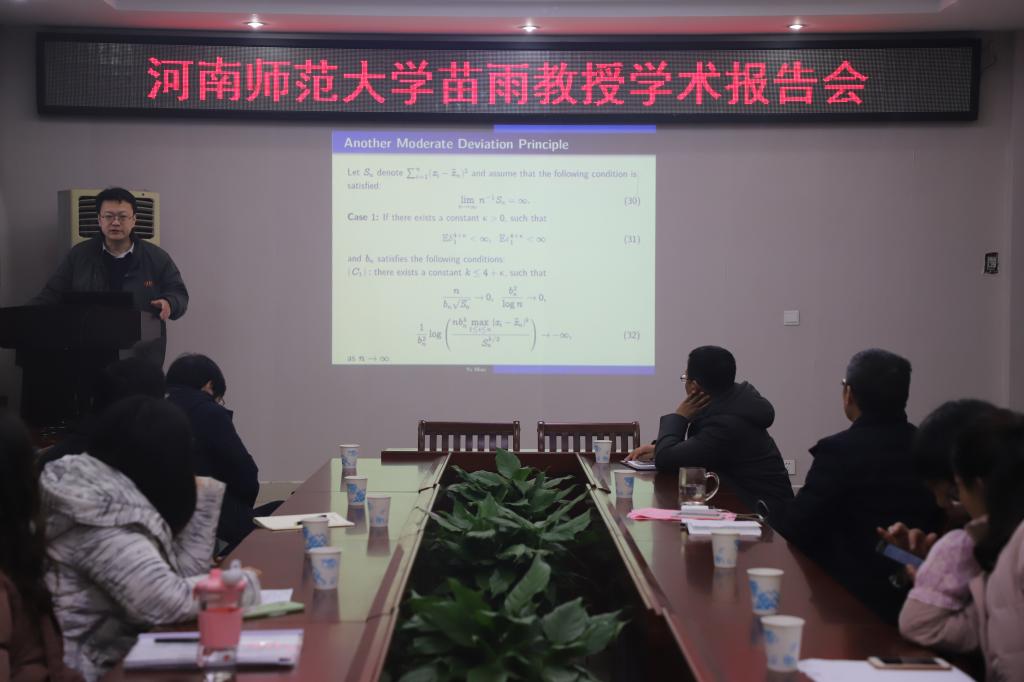 1月13日下午,应bevictor韦德国际邀请,河南师范大学苗雨教授在公司学术报告厅作了题为“Some asymptotic properties LS estimators in EV model”的报告,报告会由bevictor韦德国际副经理蔡礼明教授主持,bevictor韦德国际党委书记王娟教授,数学研究所所长宋新宇教授,公司部分老师和研究生聆听了此次报告。