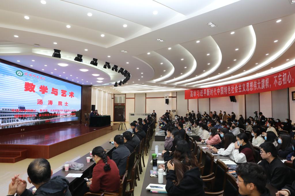 在报告中,汤涛院士通过名画《蒙娜丽莎》、巴赫古典音乐、水立方、古希腊巴特农神庙解读了绘画、音乐、建筑和雕塑等艺术中的数学;由非欧几何和分形结构展示了数学中的艺术;结合电影、绘画、3D打印,人工智能等阐述了高科技时代的数学与艺术。报告结束后,汤涛院士与现场师生进行了热烈的交流互动,耐心细致地回答了大家的提问。