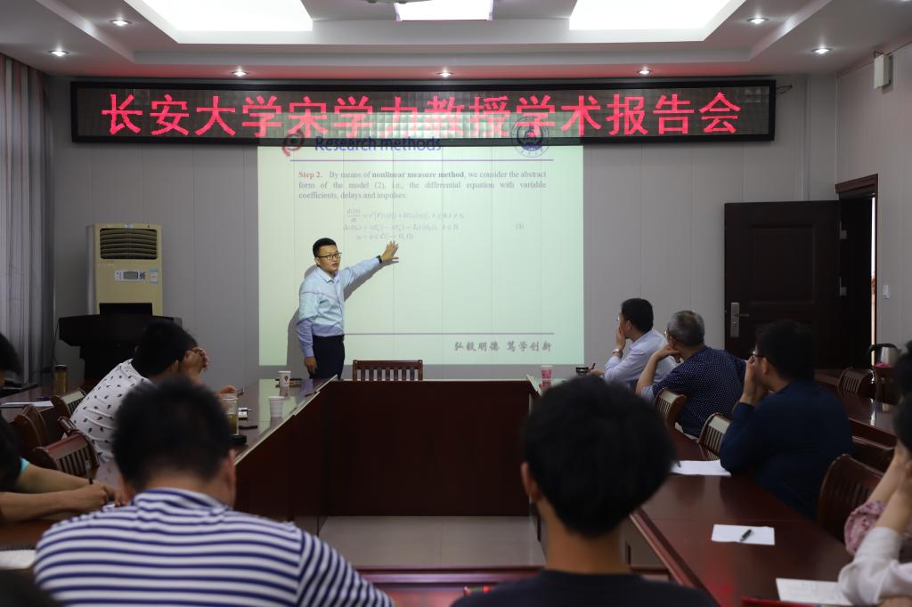 在报告中,宋学力教授首先介绍了具有脉冲和多比例延迟的细胞神经网络的全局渐近稳定性;其次,通过一些变换,将具有比例延迟的脉冲细胞神经网络转换为具有可变系数和恒定延迟的脉冲细胞神经网络;最后,宋教授通过非线性测度证明了后者的全局指数稳定性,并为全局渐近稳定性提供了充分条件。报告结束后,宋学力教授针对师生们提出的问题给出了详细的解答,并与师生就报告内容进行了热烈的讨论。 此次学术报告会既开阔了大家的视野,又提供了研究思路。