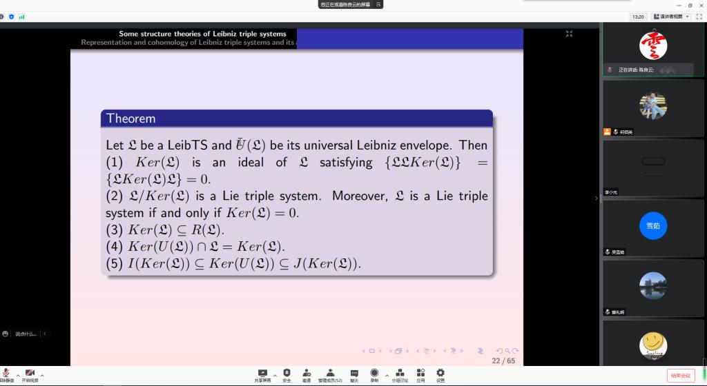 报告中陈良云教授阐述了Lebniz三系的基本理论,详细讲解了Lebniz三系的上同调、扩张和形变及其应用,同时概述了该问题研究的最新进展。报告结束后,陈良云教授针对师生们提出的问题给出了详细的解答,并与师生就报告内容进行了热烈的讨论,此次学术报告会既开阔了大家的视野,又提供了新的研究思路。
