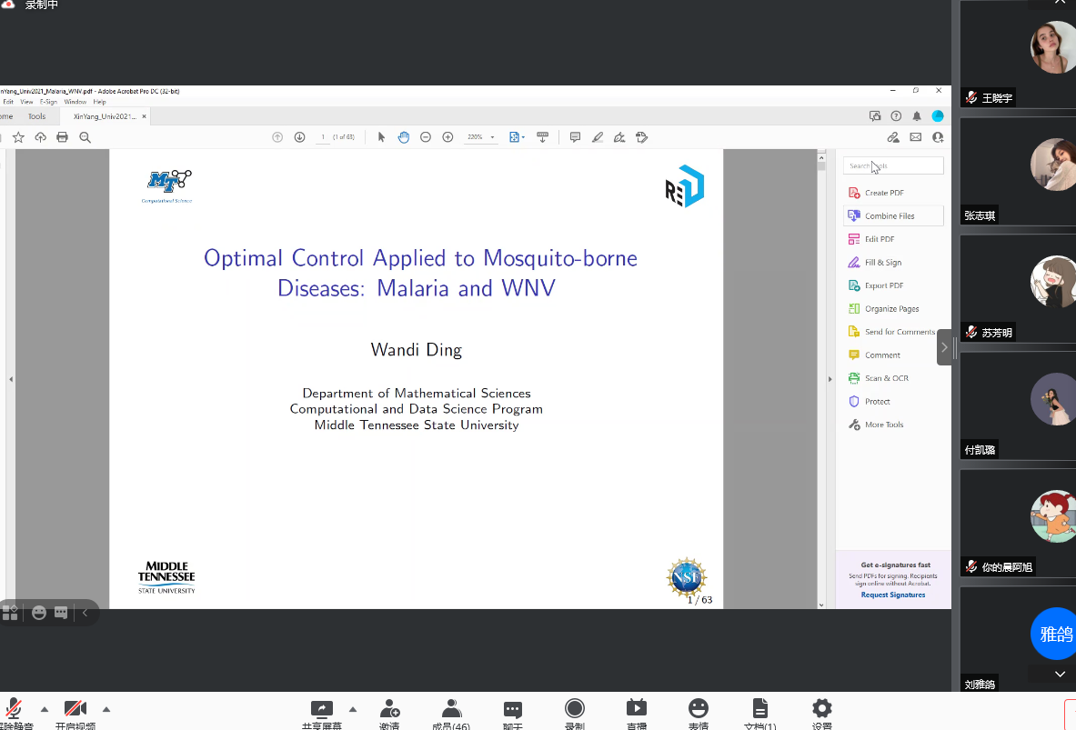 10月30日上午,应bevictor韦德国际邀请,美国中田纳西州立大学丁婉菂教授通过腾讯会议平台为公司研究生及相关研究方向老师作了题为《Optimal control applied to mosquito-borne diseases: Malaria and WNV》的学术报告。报告会由bevictor韦德国际经理蔡礼明教授主持。