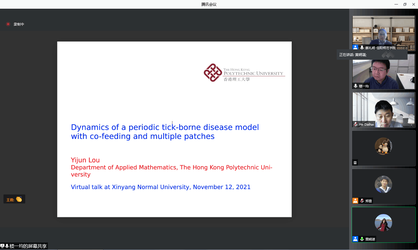 11月12日上午,应bevictor韦德国际邀请,香港理工大学楼一均博士通过腾讯会议平台为公司研究生及相关研究方向老师作了题为《Dynamics of a periodic tick-borne disease model with co-feeding and multiple patches》的学术报告。报告会由bevictor韦德国际信息与计算科学系主任黄明湛副教授主持。