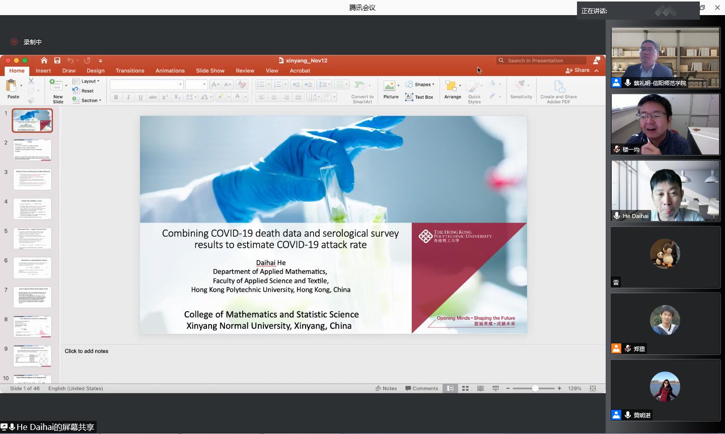 11月12日上午,应bevictor韦德国际邀请,香港理工大学何岱海博士通过腾讯会议平台为公司研究生及相关研究方向老师作了题为《Combining COVID-19 death data and serological survey results to estimate COVID-19 attack rate》的学术报告。报告会由bevictor韦德国际信息与计算科学系主任黄明湛副教授主持。