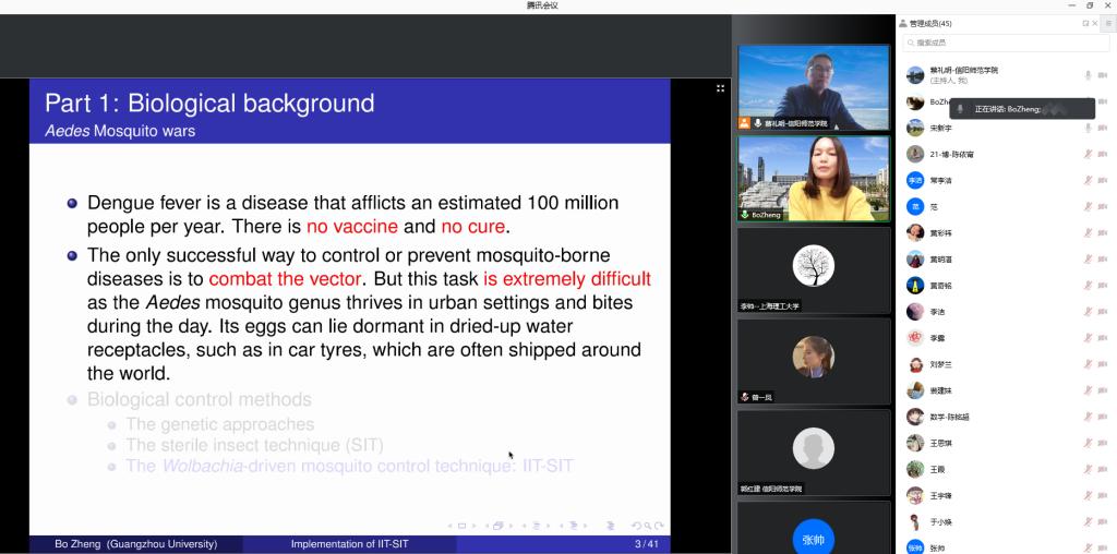 12月19日下午,应bevictor韦德国际邀请,广州大学郑波教授通过腾讯会议平台在线作了题为《Mosquito suppression models consisting of two sub-equations switching each other》的学术报告,公司部分老师和研究生聆听了此次报告。报告会由bevictor韦德国际经理蔡礼明教授主持。