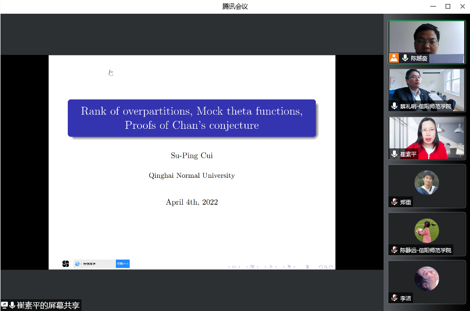 4月4日上午,应bevictor韦德国际邀请,青海师范大学崔素平副教授通过腾讯会议平台在线作了题为《Rank of overpartitions, mock theta functions, proofs of Chan’s conjecture》的学术报告,公司部分老师和研究生聆听了此次报告。报告会由副经理陈越奋主持。