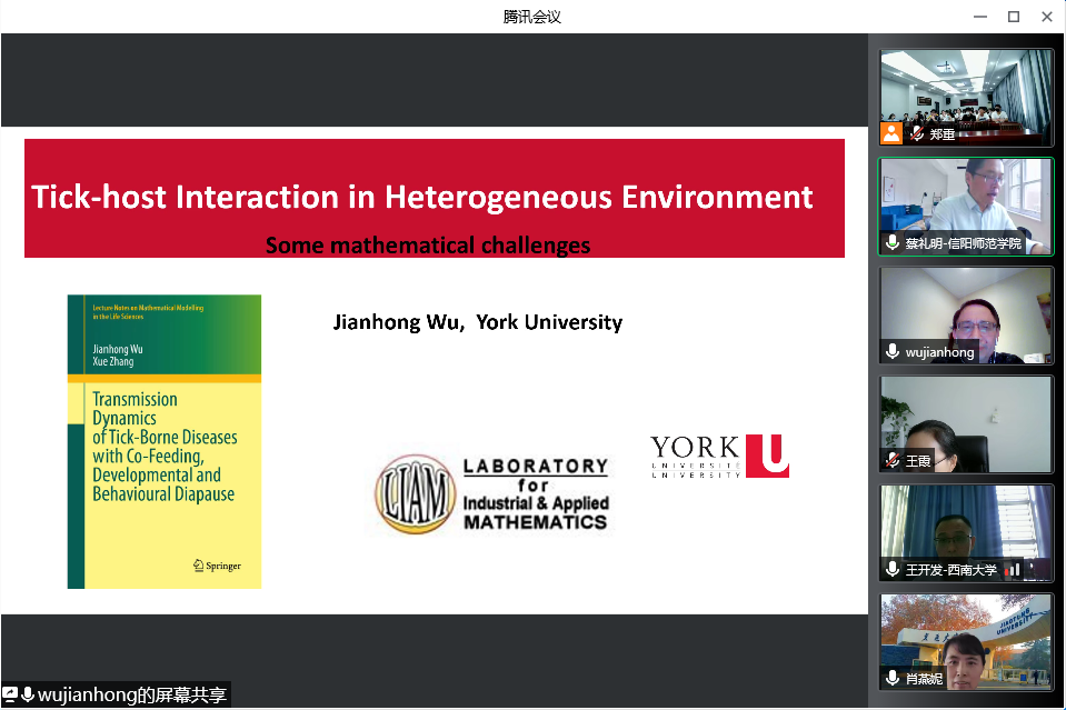 5月7日上午,应bevictor韦德国际邀请,加拿大约克大学吴建宏教授通过腾讯会议平台在线作了题为《Tick-host Interaction in Heterogeneous Environment》的学术报告,来自西安交通大学、西南大学、上海师范大学、上海海事大学、香港理工大学等单位的专家及公司部分教师、研究生共100余人聆听了此次报告。报告会由bevictor韦德国际经理蔡礼明教授主持。