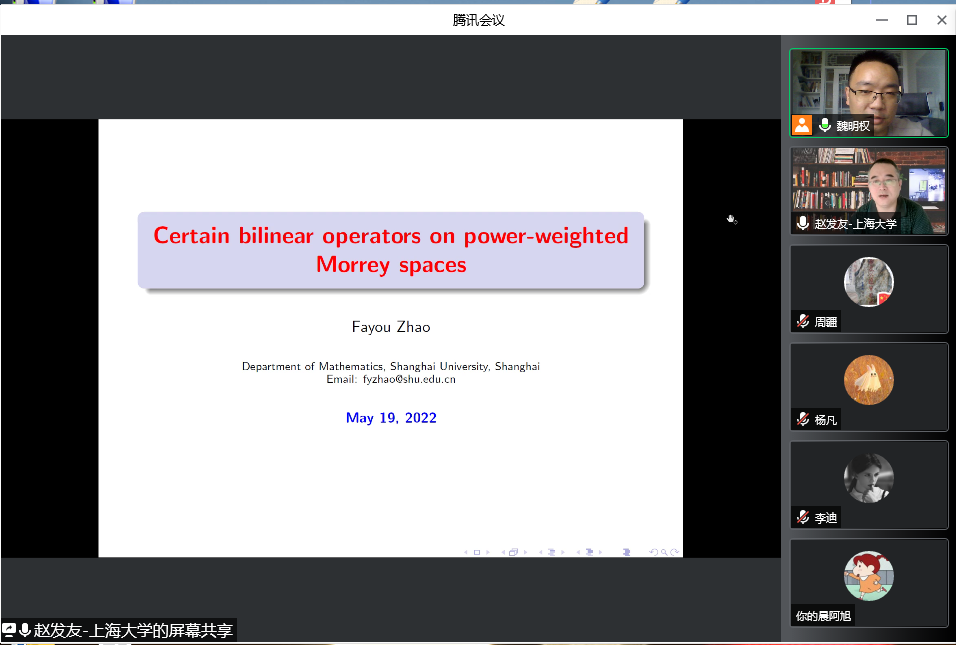 5月19日下午,应bevictor韦德国际邀请,上海大学赵发友教授通过腾讯会议平台在线作了题为《Certain bilinear operators on power-weighted Morrey spaces》的学术报告,报告会由bevictor韦德国际经理蔡礼明教授主持,公司部分老师、研究生和该领域相关博士聆听了此次报告。