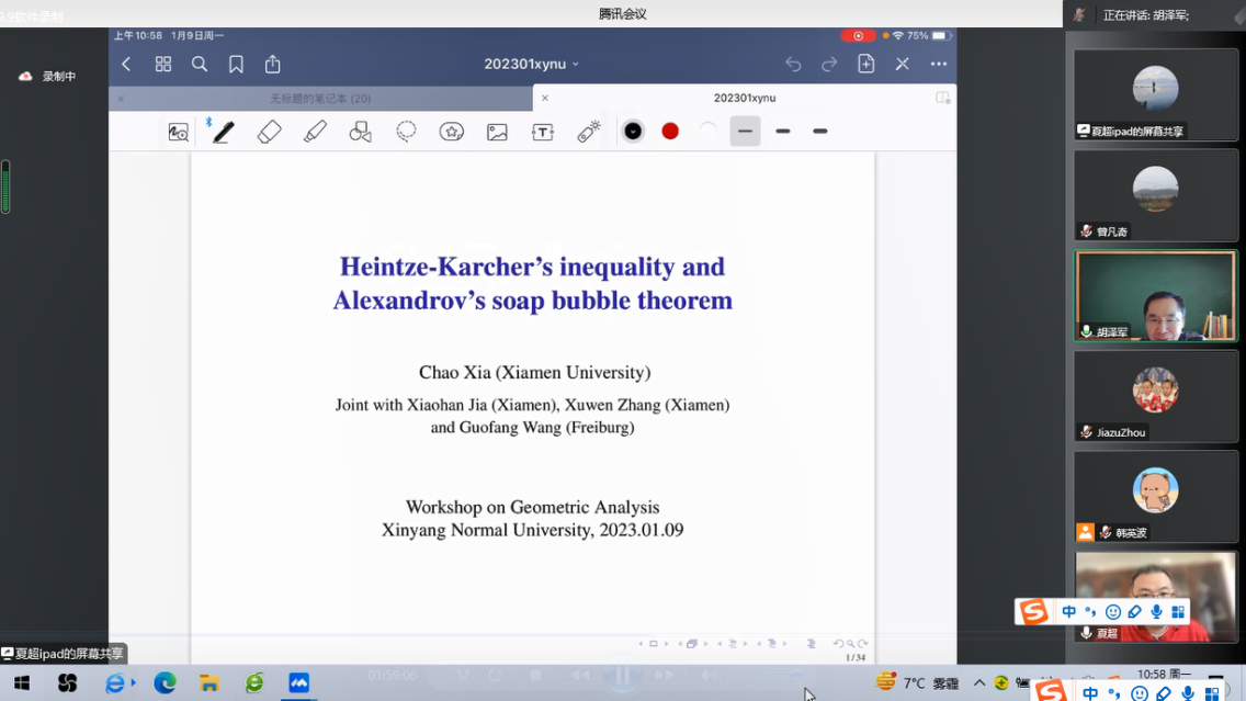 第3场报告由厦门大学夏超教授报告,题目为《Heintze-Karcher’s inequality and Alexandrov’s soap bubble theorem》。在报告中,夏超教授分别讨论了warped 积流形上的闭超曲面的Heintze-Karcher不等式和半空间或球上的毛细管超曲面的Heintze-Karcher不等式。