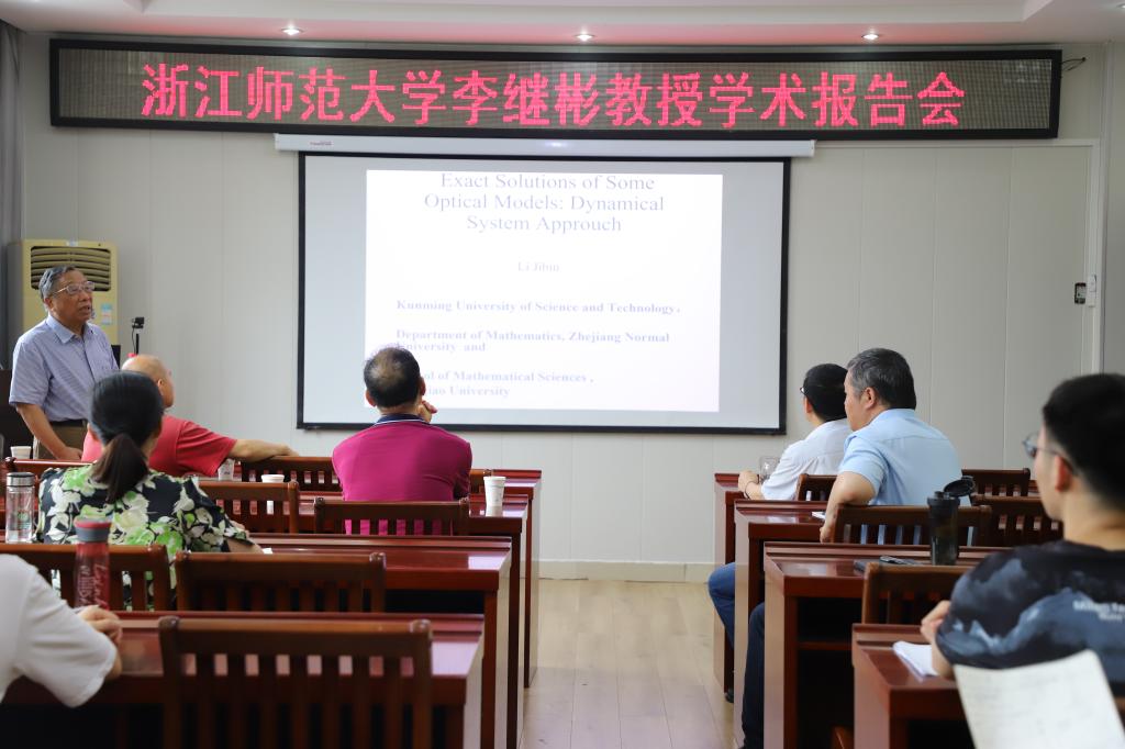 李继彬教授以《Exact Solutions of Some Optical Models: Dynamical System Approach》为题,介绍了几类经典光学系统的物理背景,指出了一些学者研究论文中的不足并给出修正后的结果。详细讲解了不同类型孤立子的定义与判别,从动力系统出发,给出了几类物理系统行波解的精确解。除此之外,对于研究生如何寻找合适的课题与研究方法,李继彬教授给出了自己的建议。