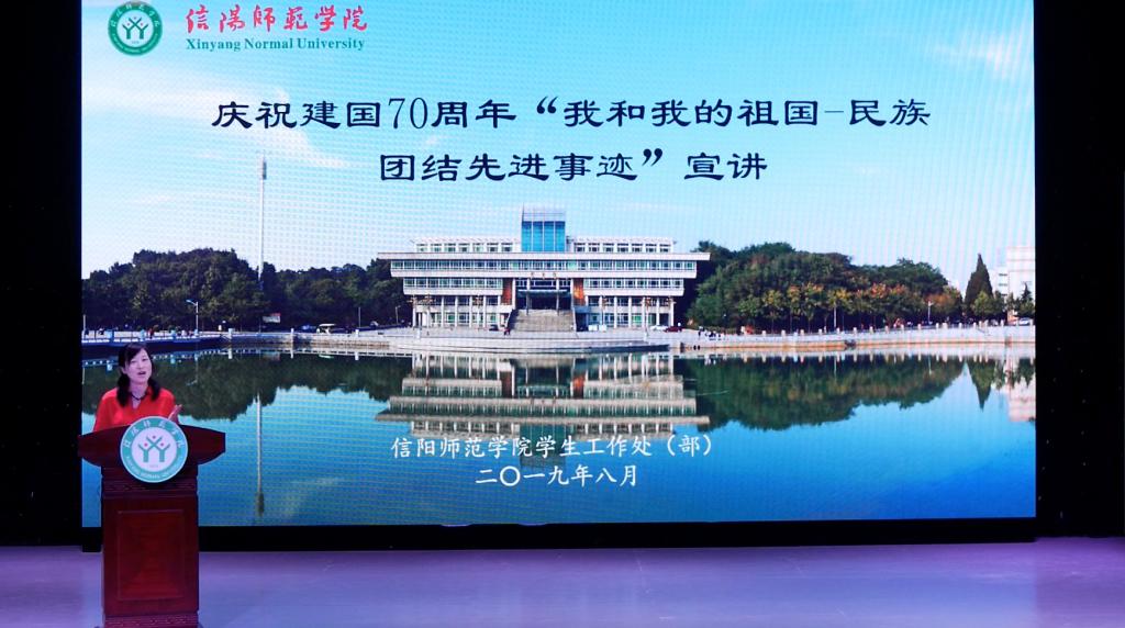 今年6月,省委高校工委、省教育厅联合印发了《中共河南省委高校工委办公室 河南省教育厅办公室关于庆祝建国70周年在全省教育系统开展“我和我的祖国——民族团结进步先进事迹报告会”宣讲活动的通知》。公司高度重视,员工工作部成立工作小组,在全校范围内进行推荐、遴选,公司谢艳丽老师被选为教师组参赛选手。公司和公司利用暑假对宣讲作品反复推敲,组织宣讲拍摄,赛前指导,确保了质量。