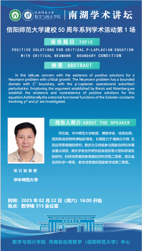 庆建校50周年之南湖讲坛: 华中师范大学邓引斌教授——Positive Solutions for Critical p-Laplacian Equation with Critical Neumann Boundary Condition