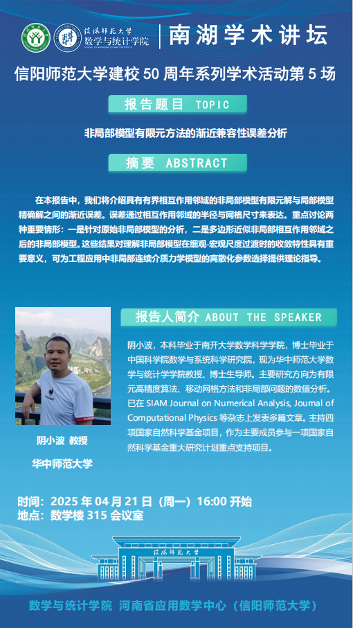 庆建校50周年之南湖讲坛:华中师范大学阴小波教授——非局部模型有限元方法的渐近兼容性误差分析