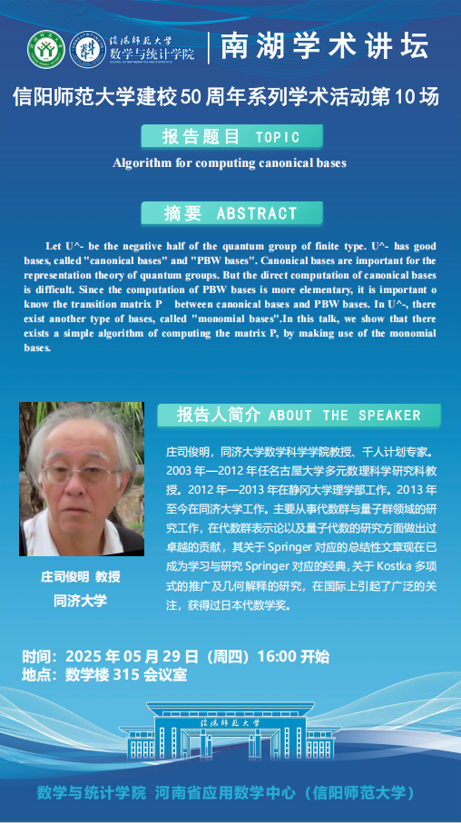 庆建校50周年之南湖讲坛:同济大学庄司俊明教授——Algorithm for computing canonical bases