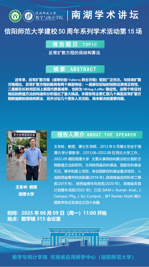 庆建校50周年之南湖讲坛:湘潭大学王冬岭教授——反常扩散方程的保结构算法