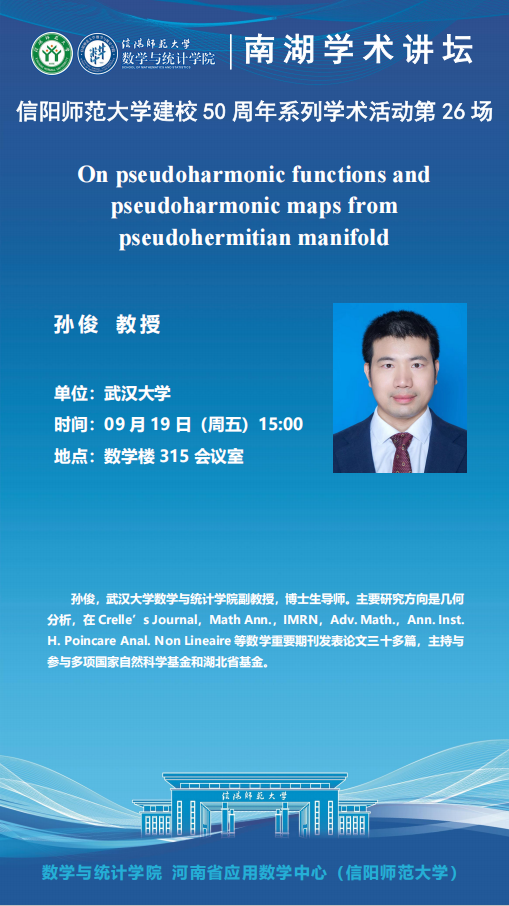 庆建校50周年之南湖讲坛:武汉大学孙俊副教授——On pseudoharmonic functions and pseudoharmonic maps from pseudohermitian manifold