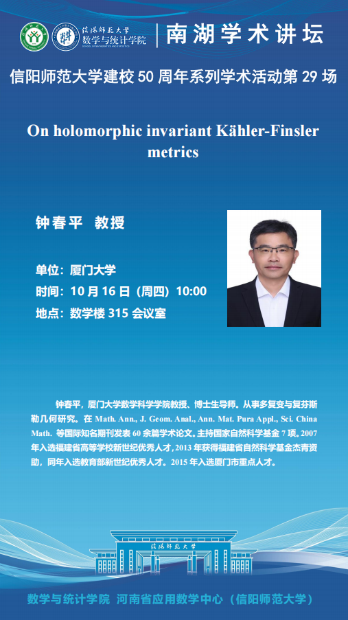 庆建校50周年之南湖讲坛:厦门大学钟春平教授——On holomorphic invariant Kähler-Finsler metrics