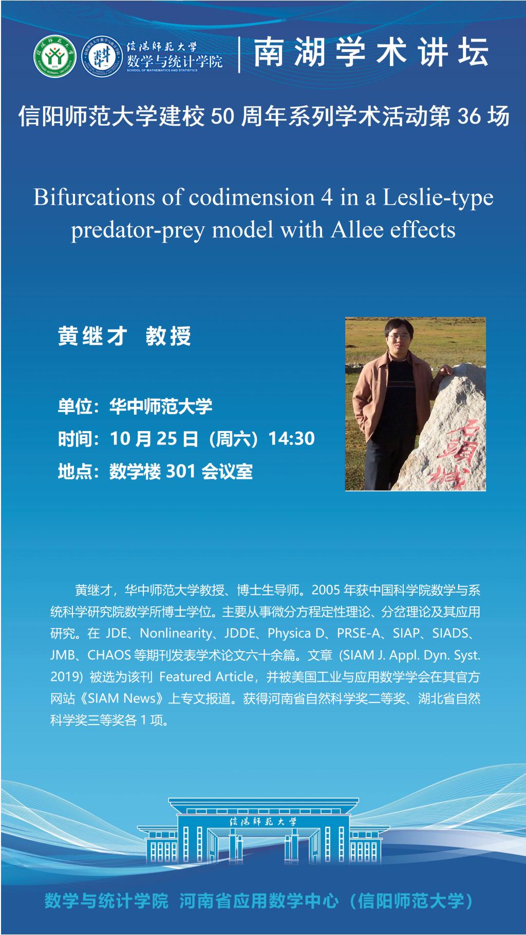 庆建校50周年之南湖讲坛:华中师范大学黄继才教授——Bifurcations of codimension 4 in a Leslie-type predator-prey model with Allee effects