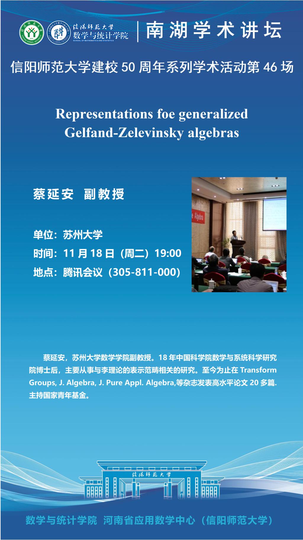 庆建校50周年之南湖讲坛:苏州大学蔡延安副教授——Representations foe generalized Gelfand-Zelevinsky algebras